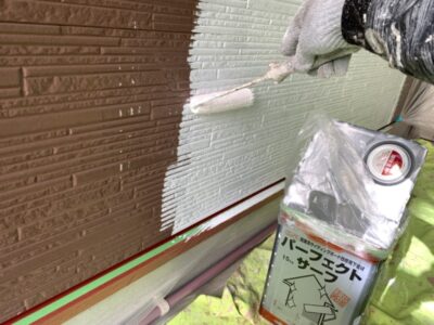 今回はブラウン系からクリーム系へ色変えになりますので、既存の下地色が透けて見えないよう白色で隠蔽性のあるパーフェクトサーフという下塗り材を使用しましたよ(^^)/
